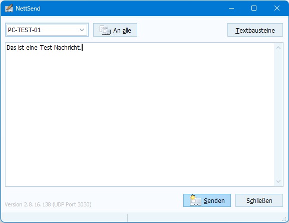 Unlike other instant messengers, no external server is required. System administration effort is minimal. As soon as NettSend is started on a PC, that PC announces itself to the other NettSend PCs in the same LAN segment and becomes reachable for NettSend messages.